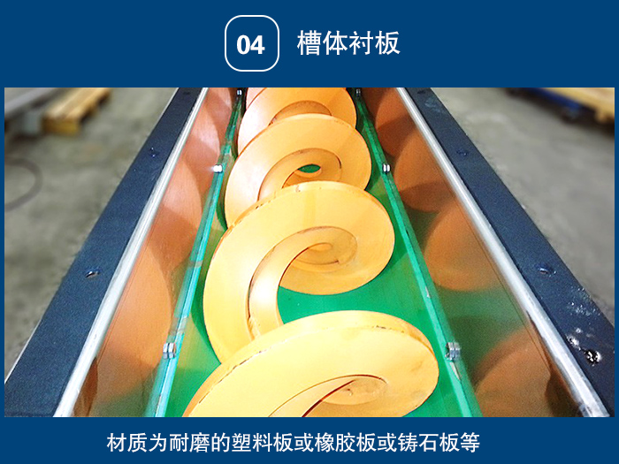 4)槽體襯板:材質為耐磨的塑料板或橡膠板或鑄石板等。進、出料口:有方形和圓形兩種,一般進、出料口形式由用戶決定。