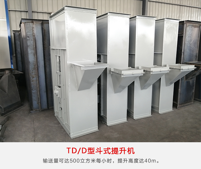 TD型斗式提升機(jī)由運(yùn)行部分料斗與牽引膠帶、帶有傳動(dòng)滾筒的 上部區(qū)段,帶有拉緊滾筒的下部區(qū)段,中間機(jī)殼,驅(qū)動(dòng)裝置,逆止制動(dòng)裝置等組成。無(wú)故障時(shí)間超過(guò)2萬(wàn)小時(shí),輸送量可達(dá)500m³/h,提升高度達(dá)40m。