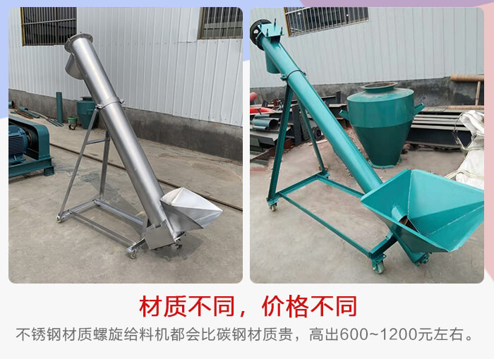 螺旋給料機可以分為碳鋼和不銹鋼材質兩種,由于這兩者材質成本有差異,碳鋼螺旋給料機適合普通物料輸送,不銹鋼螺旋給料機主要用于輸送機一些腐蝕性、高溫物料,也用于食品、醫藥等對輸送環境有衛生標準的行業,所以不銹鋼材質螺旋給料機都會比碳鋼材質貴,一般會高出600~1200元左右。