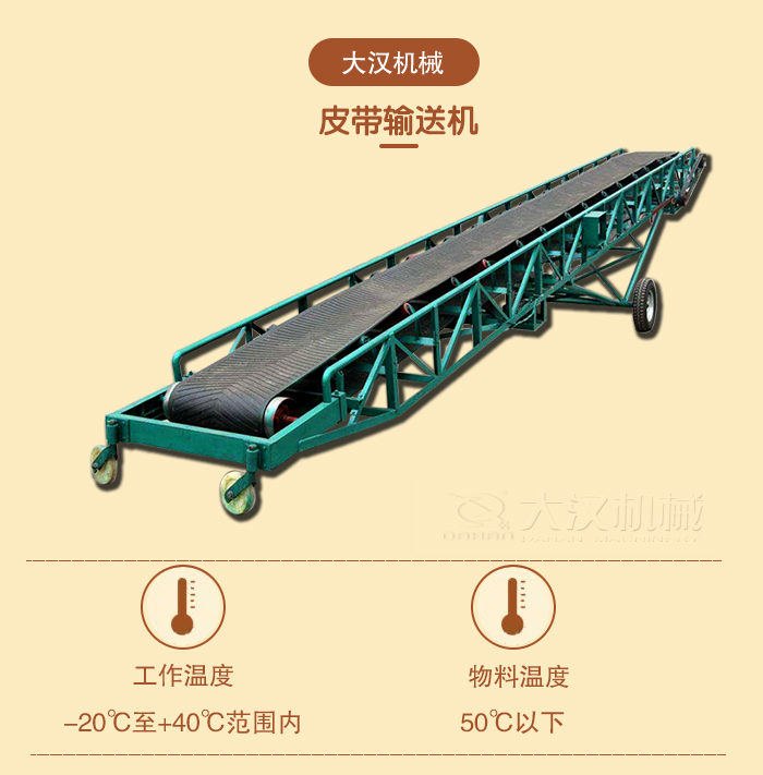 皮帶機輸送機可在環(huán)境溫度-20℃至+40℃范圍內(nèi)的使用,輸送物料的溫度在50℃以下。