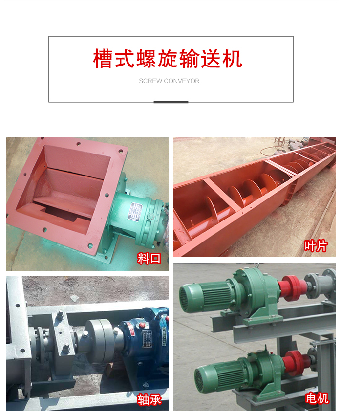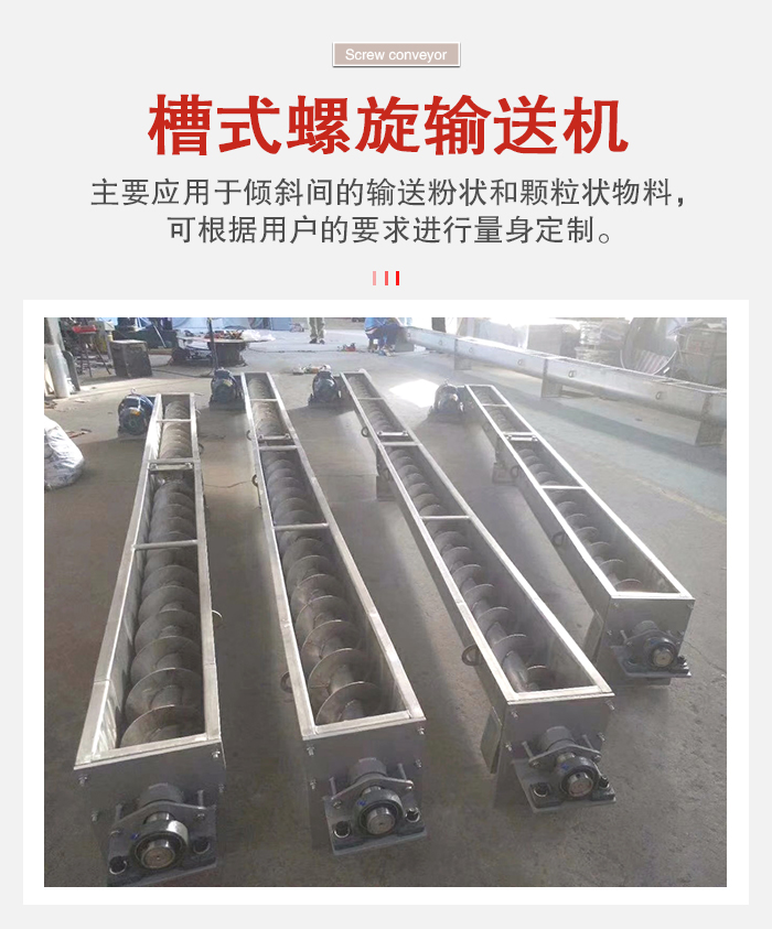 槽式螺旋輸送機是農業各部門]機械化運輸工作的主要機組,可使運輸工作減輕勞動強度,提高工作效率,應用范圍很廣。槽式螺旋輸送機適用于各行業,如建材、化工、電力、冶金、煤炭、糧食等行業,適用于水平或傾斜輸送粉狀、粒狀和小塊狀物料,如煤、灰、渣、水泥、糧食等。
