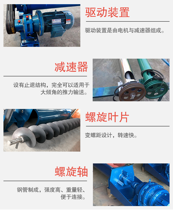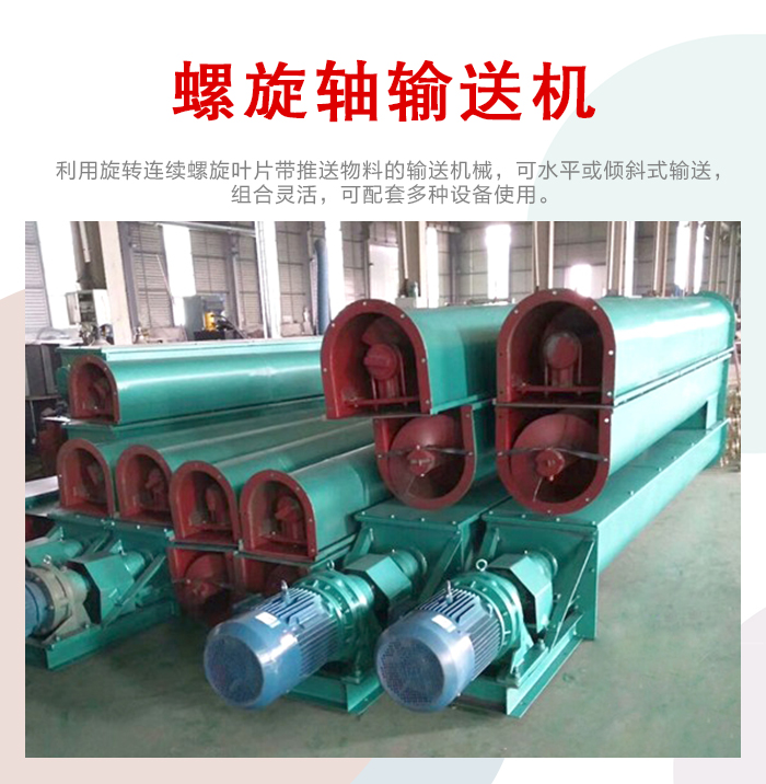 螺旋軸輸送機主要由驅動裝置,機殼、蓋板、螺旋軸、螺旋葉片、進料口、出料口等部件組成。
